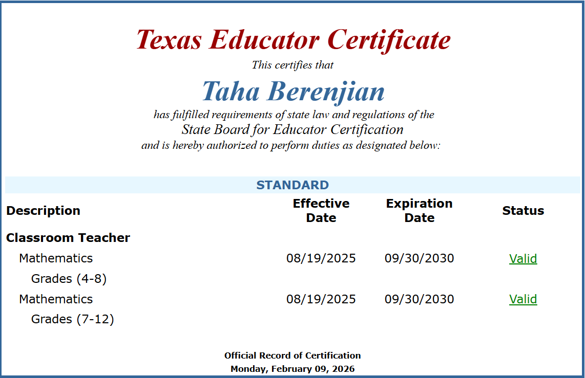 I am a fully certified Texas mathematics teacher, authorized to teach Mathematics for Grades 4–8 and